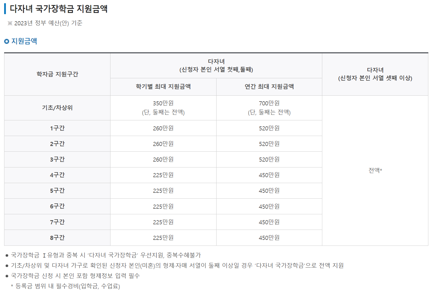 다자녀 국가장학금은 1구간부터 8구간까지 지원금액이 차등적으로 지원됩니다.1구간의 경우 학기당 260만원, 연간 최대 520만원까지 지원받을 수 있습니다. 8구간의 경우에는 학기별 225만원, 연간 최대 450만원까지 지원받을 수 있습니다. 기초 차상위 구간에 해당하는 경우 학기별 350만원, 연간 최대 700만원까지 지원 받을 수 있습니다. 신청자 본인이 다자녀 가구의 둘째부터는 전액을 지원 받게 됩니다.
