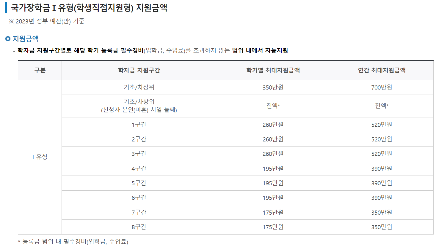 학생직접지원형인 국가장학금 I형 지원금액은 학자금 지원 구반별로 해당 학기의 입학금과 수업료를 초과하지 않는 범위에서 차등적으로 지원됩니다. 학자금 지원구간은 기초/차상위 구간과 1구간부터 8구간까지 나눠져 있습니다. 기초 차상위 구간의 경우 학기별 최대 지원금액은 350만원, 연간 최대지원금액은 700만원입니다. 기초 차상위 구간에 해당하면서 본인이 둘째일 경우에는 입학금과 수업료 전액을 금액에 상관없이 지원 받습니다.