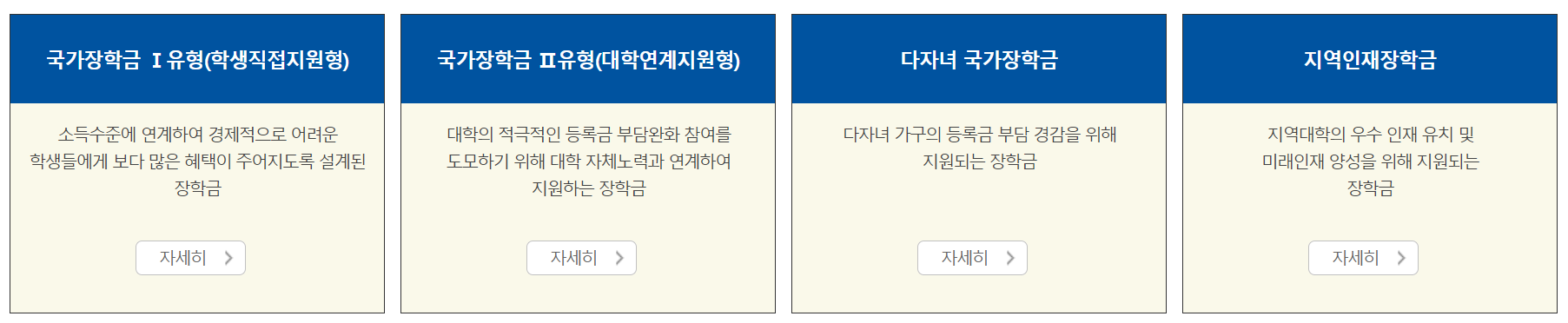 소득연계형 국가장학금은 학생직접지원형인 국가장학금 I유형, 대학연계지원형인 국가장학금 II유형, 그리고 다자녀 국가장학금이 있습니다. 여기에 지역인재장학금 및 입학금 지원 장학금이 있습니다. 각 유형별로 국가장학금 신청자격에 대해서 알아보겠습니다.