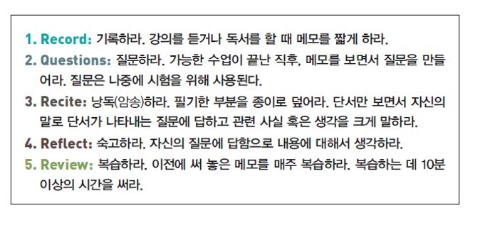 필기도 기술입니다. 미국 코넬 대학교에서 개발한 코넬 필기 시스템(Cornell Note Taking System)은 노트, 단서, 요약 세 가지를 포인트로 효율적으로 노트필기를 할 수 있도록 알려줍니다. 노트는 책을 읽거나 강의를 들으면서 핵심 사항 위주로 필기하기, 독서나 강의가 끝난 후 질문을 적고 키워드 위주로 정리하기, 배운 내용을 요악하기 등으로 구성되어 있습니다. 코넬 필기 시스템 활용법은 다섯 가지로 압축할 수 있습니다. 기록하라, 질문하라, 암송하라, 오래 생각하라, 복습하라, 이렇게 다섯 단계입니다.