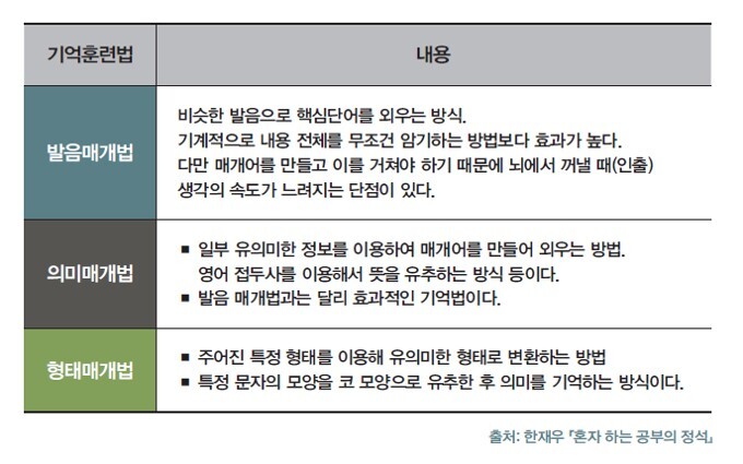 암기과목의 경우에는 매개법이 효과적입니다. 매개법은 임의적인 묶음을 기억할 때 효과적입니다. 발음매개법, 의미매개법, 형태매개법으로 구분됩니다.