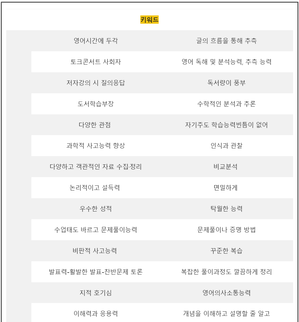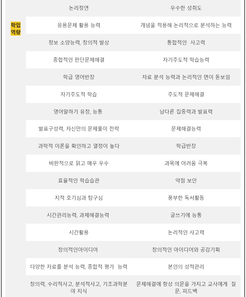 다음은 명문대 상위권 대학의 학생부에 기록에서 많이 찾아볼 수 있는 키워드들입니다. 물론 이것 외에 태도 표현과 동사표현이 있지만 오늘은 학업역량의 키워드만 알아보겠습니다.