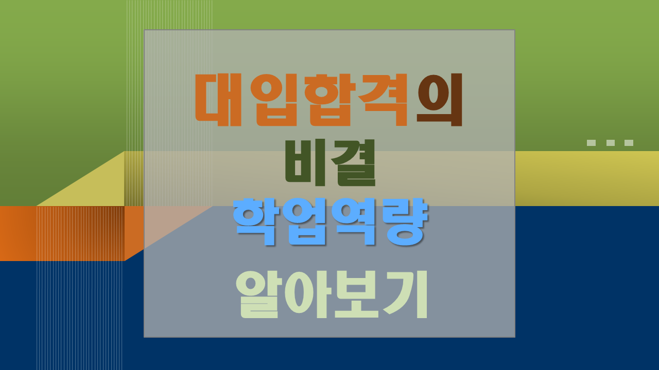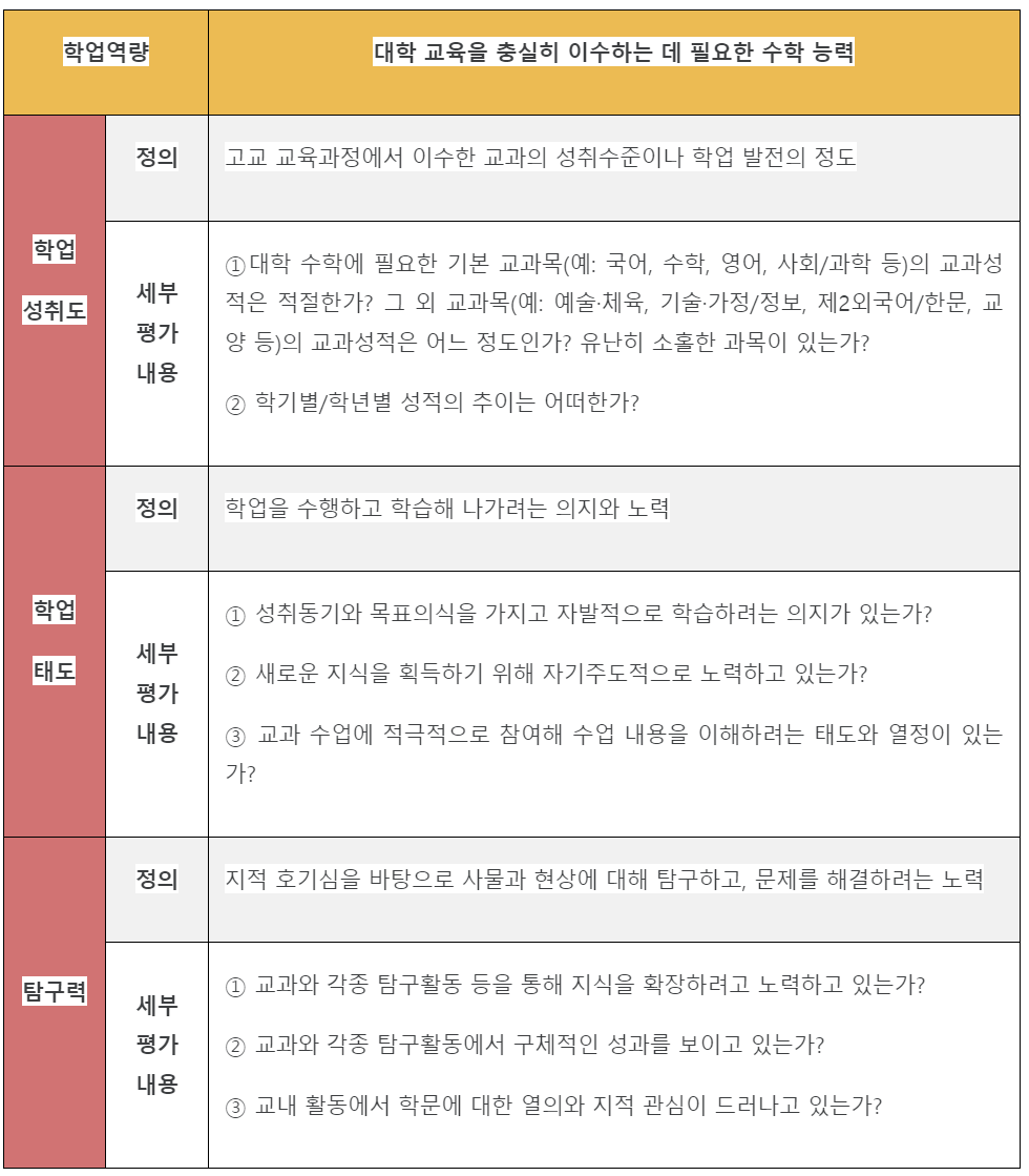 먼저 학업역량을 말하자면, 학업역량은 대학교육을 충실히 이수하는 데 필요한 수학능력으로, ‘학업성취도’, ‘학업태도’, ‘탐구력’의 3가지 평가항목으로 구성됩니다.