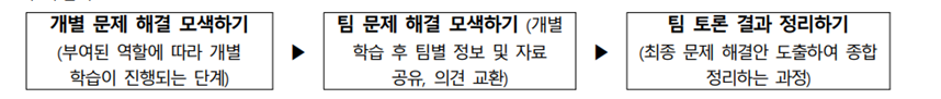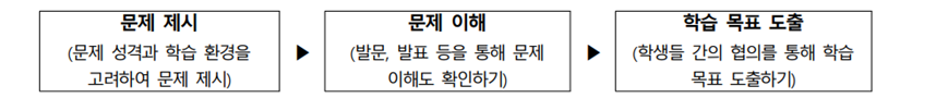 2. 학생 중심의 수업으로 진행됩니다. 학생은 문제 해결자로 학습에 참여하여 좋은 해결책을 위해 많은 정보와 지식들을 직접 다루면서 의미와 이해를 추구하고 학습에 상당한 책임을 맡게 됩니다.