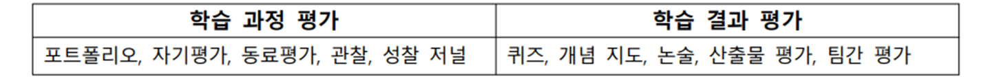5. 다양한 평가 방법이 요구됩니다. 결과 자체보다는 전체 수행 과정을 평가하며 이를 위해 다양한 형태의 평가를 이루어져야 합니다.