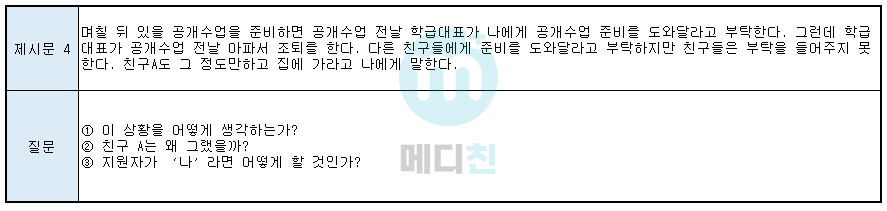 그리고 의사소통과 대인관계 영역에서는 가상의 인물이 있다고 생각하고 답변을 유도합니다. 친구(팀원)들이라면 어떻게 했을 것 같아요? 등의 식으로 구성됩니다. 예를 들어서 다음과 같은 문제가 있습니다.