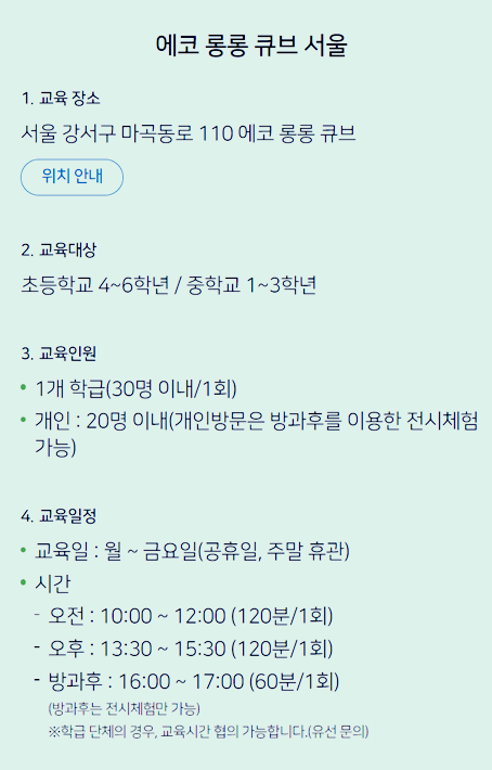 에코 롱롱 큐브 교육 신청안내 Step 1. 교육신청 페이지 "에코 롱롱 큐브 > 신청하기"를 클릭하여 신청하기 페이지를 엽니다. Step 2. 교육 날짜 선택 캘린더에서 원하는 교육 날짜 및 시간의 신청 버