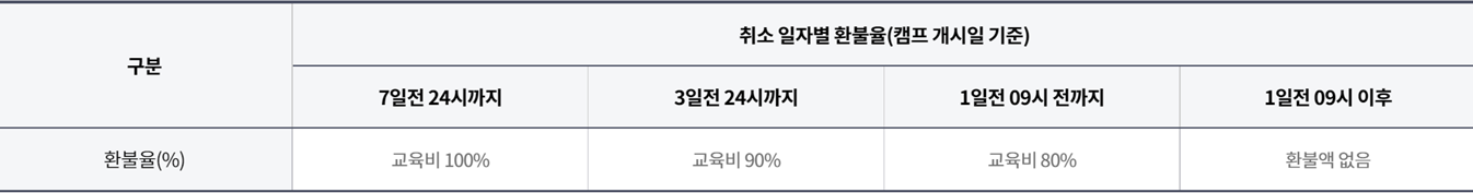 - [캠프취소] 개인사정으로 캠프 취소 시 다른 학생이 참가할 수 있도록 접수 마감일 전에 취소해주세요.