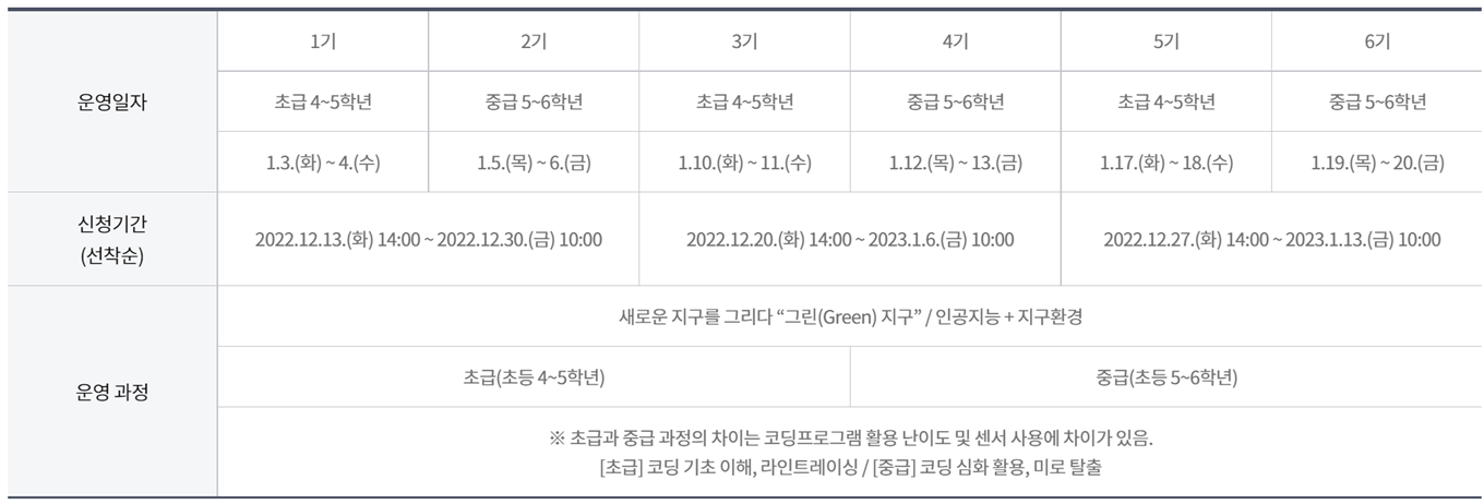 - [과정 선택] 겨울방학 과학캠프는 초급(4~5학년), 중급(5~6학년) 과정으로 운영되오니 5학년은 예약 전사전 수준진단 체크리스트 확인 후 신청해주세요.