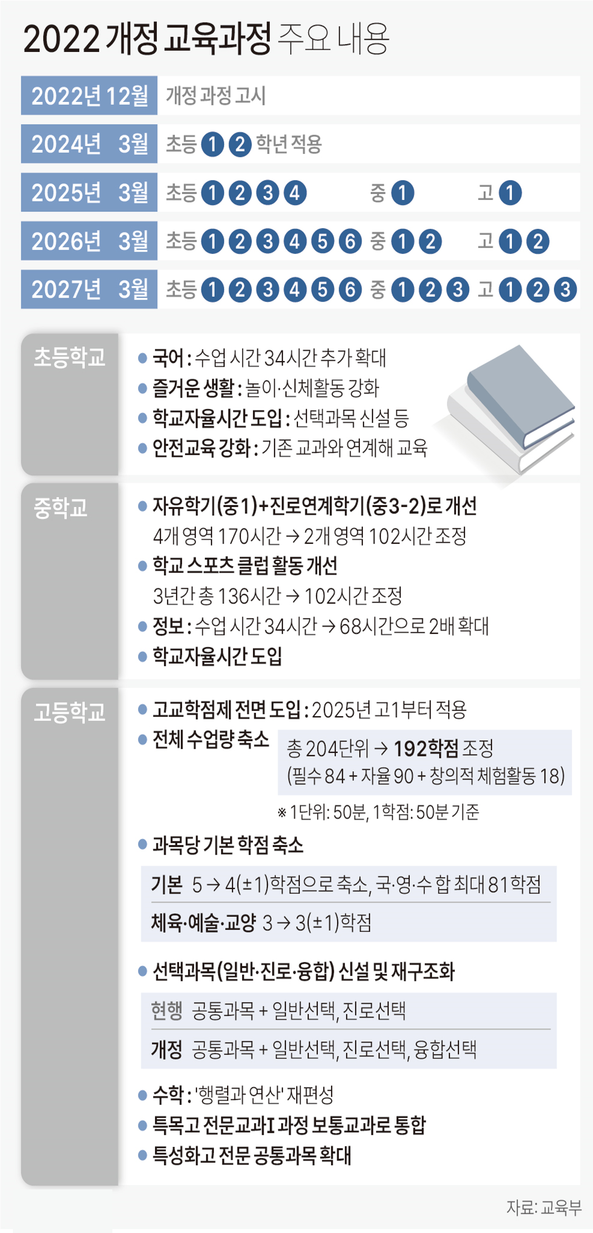 고등학교 1학년은 공통과목 위주로 듣고 2∼3학년 때 학생의 진로나 적성에 따라 '일반 선택과목', '진로 선택 과목', '융합 선택 과목' 등 다양한 과목을 학생이 자율적으로 골라 들을 수 있도록 했습니다. 한글 교육을 강화하기 위해 초등 1∼2학년의 국어 시수는 448시간에서 482시간으로 34시간 늘어납니다.