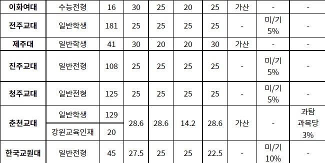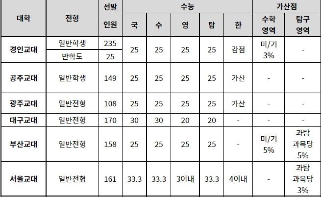 수능은 국어, 수학, 영어, 탐구 영역을 동일한 비율로 적용하는 대학들이 많고, 동일한 비율을 적용하지 않더라도 영역 간 반영 비율의 차이가 크지 않은 편입니다. 단, 서울교대는 영어와 한국사를 점수에 포함하지 않고 최저학력기준으로 설정해 영어는 3등급, 한국사는 4등급 이내를 반드시 성취해야 하며, 춘천교대는 영어 반영 비율이 14.2%로 낮습니다. 눈여겨봐야 할 것은 수학(미적분/기하) 및 과학탐구에 가산점 부여 여부입니다. 경인교대, 부산교대 등 8개 대학이 수능에서 미적이나 기하, 과학탐구를 치렀다면 이에 가산점을 부여합니다.