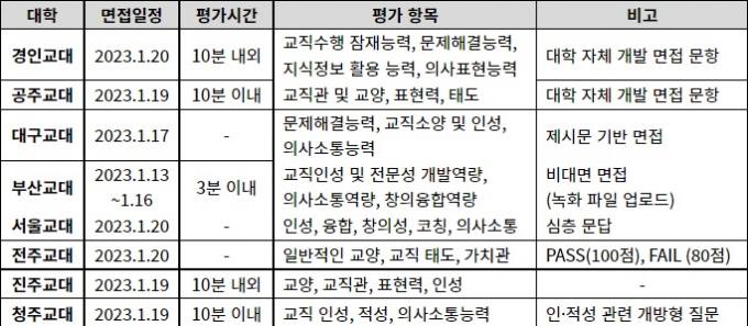 면접 반영 비율은 9.1%에서 30%로 대학에 따라 차이가 큰데, 명목상 반영비율이 높더라도 면접에서 기본점수를 부여하기 때문에 실질 반영률은 높지 않은 경우가 많습니다. 부산교대나 진주교대, 청주교대의 경우 명목상 면접 반영 비율은 20%이지만 실질 반영률은 각각 4.8, 5.9%, 9.1%로 내려갑니다.