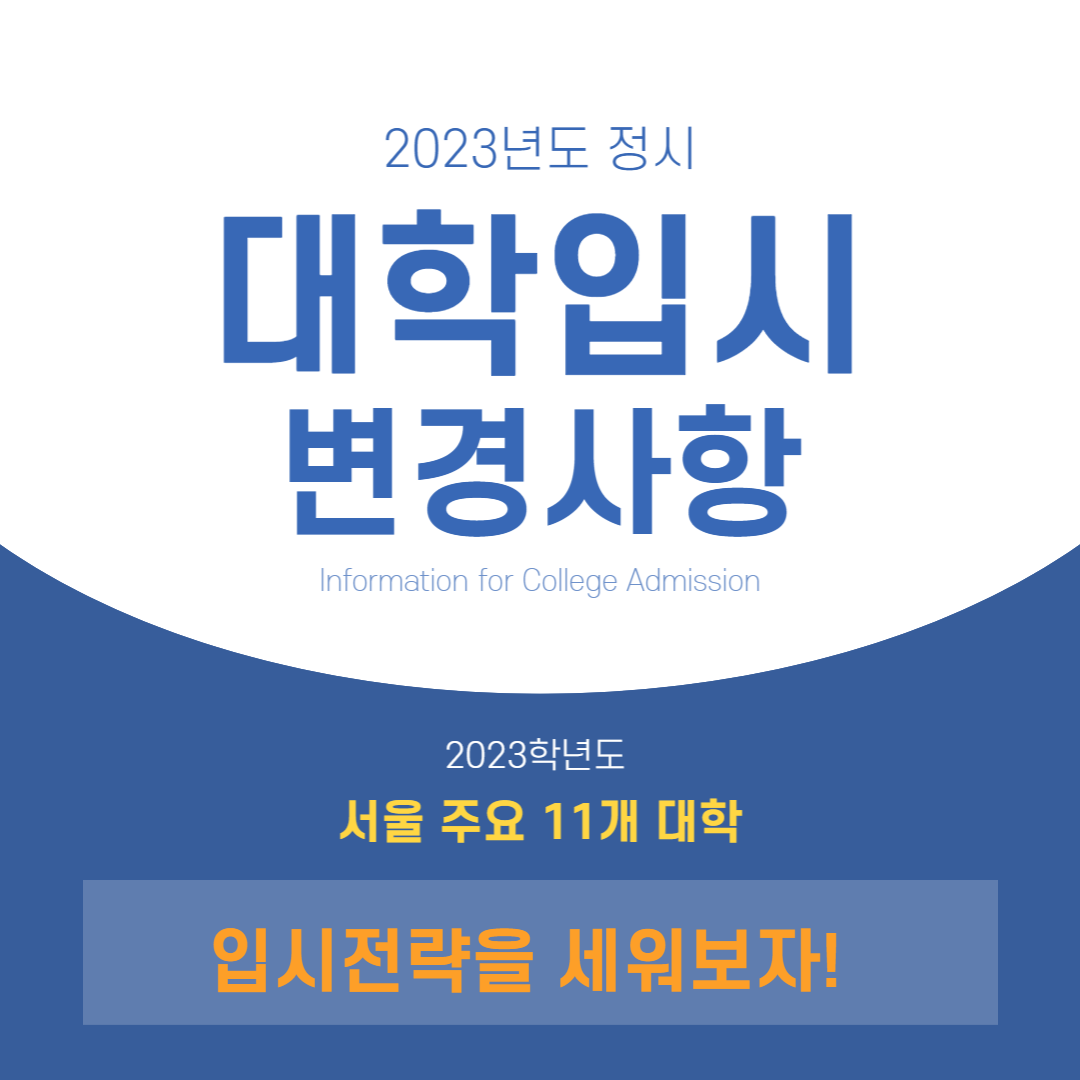 안녕하세요. 오늘은 2023학년도 대학입학 전형 일정을 알아보고, 서울 주요 11개 대학의 정시 모집의 변경 사항을 알아보도록 하겠습니다. 수능이 얼마 남지 않은 시점에서 2023학년도 정시도 한 걸음 더 다가오고 있습니다. 자신에게 취약한 부분을 되짚고 보완, 마무리해야 하는 중요한 시기인 만큼, 자신의 상황에 맞는 전략적 준비도 필요합니다. 이때, 매년 발생하는 정시 선발 방법의 크고 작은 변화를 체크하는 것이 전략적 준비에 첫걸음이 될 수 있습니다. 2023학년도 정시에서 주요 대학들의 변화를 살펴봅시다.