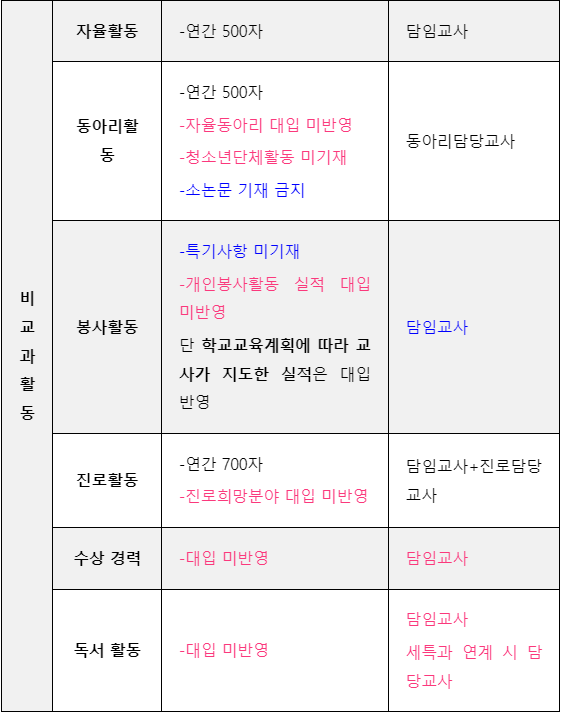 자율동아리, 개인봉사활동, 진로희망분야, 수상 경력, 독서 활동, 영재·발명교육 실적 미반영
