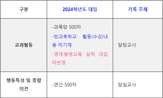 2024학년도부터는 자율동아리, 개인봉사활동, 진로희망분야, 수상 경력, 독서 활동, 영재·발명교육 실적 등이 생기부에 기재는 되나 대입에는 반영되지 않습니다.