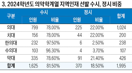 2024학년도 의약학계열 지역인재 선발 수시, 정시 비중